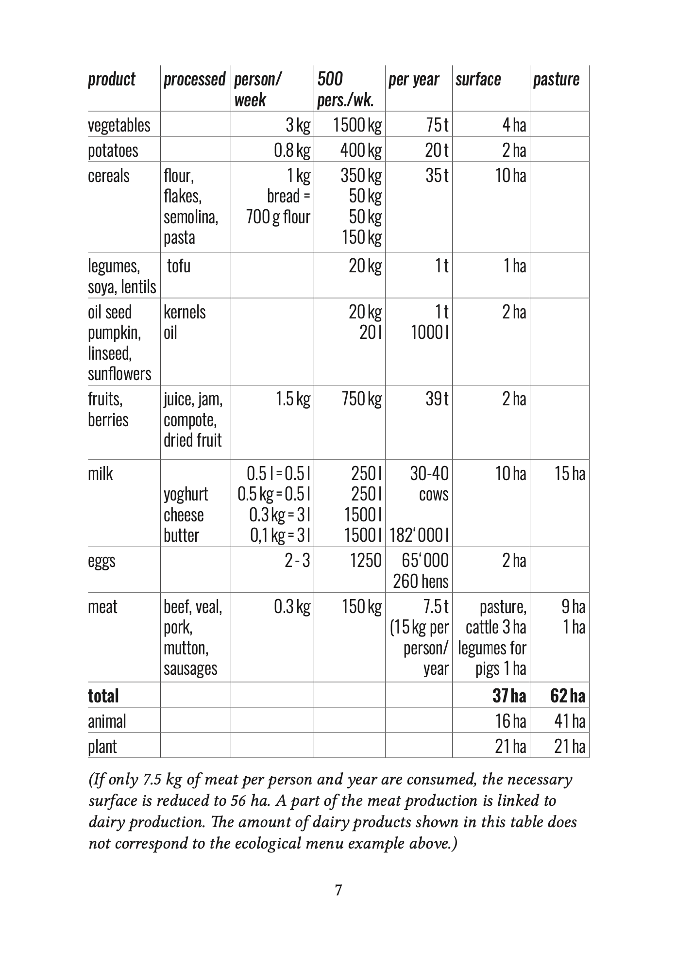 Contemporary attempts to implement these changes and roughly halve the land consumption of a Zurich citizen, established community supported agriculture systems, «Solawis». The proposal calculated an average agricultural land consumption of 1250 m2 per capita for a flexitarian and 950 m2 for a vegetarian diet. (11)